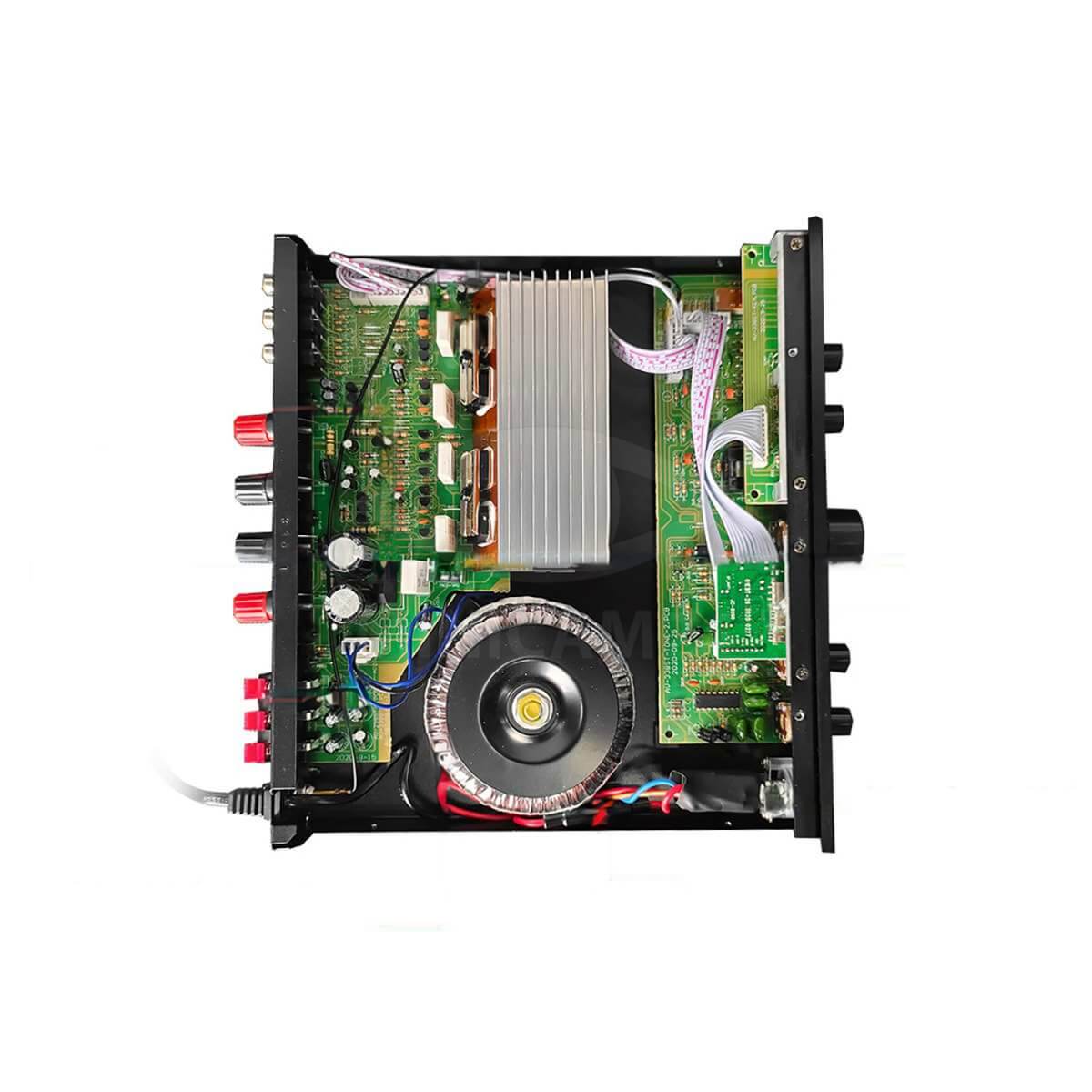 Sunbuck AV-338ST – пятиканальный 5.1 усилитель с поддержкой звука Surround, современным модулем Bluetooth 5.1 для беспроводного подключения смартфонов. Для проводного подключения используются несколько позолоченных RCA, два источника можно подключить одновременно. Пассивная акустика подключается к стандартным разъемам с пружинной клеммой, а для активного сабвуфера предусмотрен RCA выход. Помимо этого устройство поддерживает воспроизведение музыки в формате mp3 с флешки или карты SD объемом до 64Гб, а также включает тембр блок, встроенный приемник FM радио и функцию караоке с возможностью подключить два микрофона через входы 6.3мм и регулировать эффект echo и их громкость отдельно от общей. В комплект входит пульт для дистанционного управления режимами воспроизведения, встроенным плеером и радиоприемником.